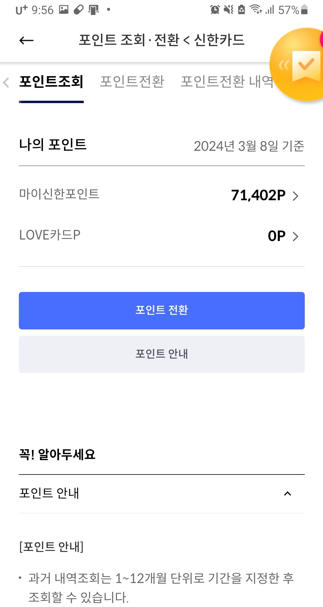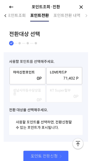 1. 카드 앱에서 포인트 조회 후 러브카드포인트를 마이신한포인트로 전환 신청합니다.